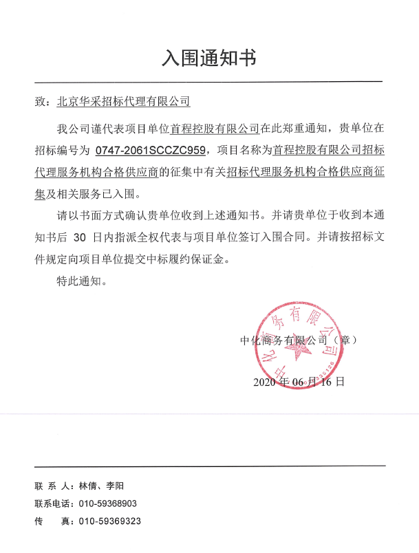 北京華采招標代理有限公司成功入圍首程控股有限公司招標代理機構